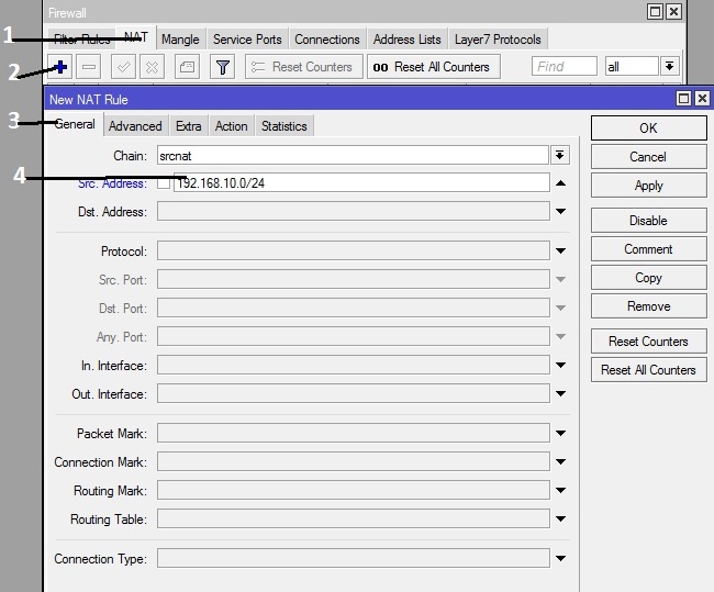 9. Masuk ke IP > Firewall tab Nat Pilih Tab NAT Klik tanda “+” Pilih tab “General” Chain “srcnat” Src.Address “192.168.10.0/24” Pilih Tab Action Action “masquerade” Apply / OK Sampai disini internet untuk ke local sudah bisa digunakan dengan catatan ip address harus diisikan ke masing masing computer, jika tidak mau ribet anda bisa menggunakan settingan DHCP jadi nanti masing masing computer bisa mendapatkan ip address secara otomatis.
